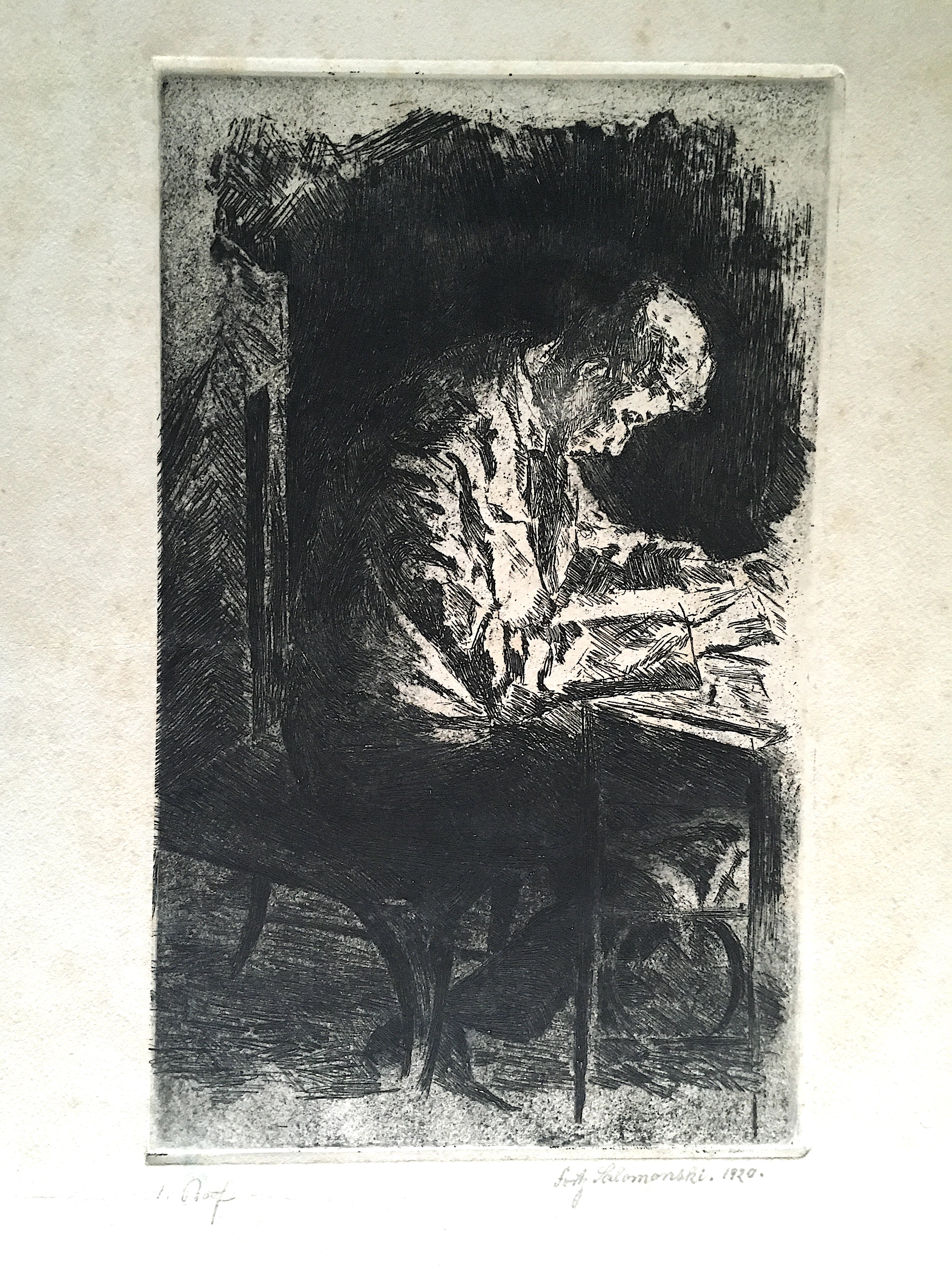 362. [ART] FREDERICK "Fritz" SOLOMON (1899-1980) German Expressionist artist. Original 1920 etching, signed in pencil, approx. 11.5 x 7 in. plus margins. Unframed. Solomon won the Mowbray Prize [1944] in London; was listed in WHO'S WHO IN ART [1954 London edition]. He studied art with such famous German artist's as: Max Liebermann, Martin Brandenburg, Eugene Spiro & Willy Jaeckel [Masterclass]. Exhibitions: Berlin, Cologne, Capetown, Haifa, London [Royal Academy], U.S., and in 1958 had one-man show at the Palacio de Bellas Artes in Havana, Cuba. In 1956 several of his paintings were exhibited at the Butler Institute of American Art, Youngstown, Ohio. He died in the U.S. We purchased his personal papers and most of his drawings at his estate sale. His work is fairly scarce. The photos shown below DO NOT accompany this drawing and are not for sale. Also, showing below is a copy of Royal Academy of Arts notification that Samuel Courtauld has selected a painting by Solomon for purchase in 1945. Courtauld, who would died two tears later, was the founder of the Courtauld Art Institute in England. Courtauld had formed an important art collection including multiple works by Manet, Cezanne, Renoir etc., which he gave to the Courtauld and the Tate. He had purchased at least 5 paintings by Frederick Solomon and when he saw the painting JACOB at Solomon's exhibition at the JABE Gallery he ordered that the painting be sent to the TATE Gallery but he died a few days later and the purchase never took place. Very RARE...............200-300